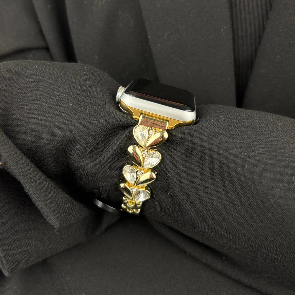 Bloom with brilliance. The Sparkle Petal Strap in Gold is designed to add a touch of floral-inspired glamour to your Apple Watch. With petal-like detailing and shimmering accents, this strap captures the elegance of nature while giving your wrist a radiant glow.